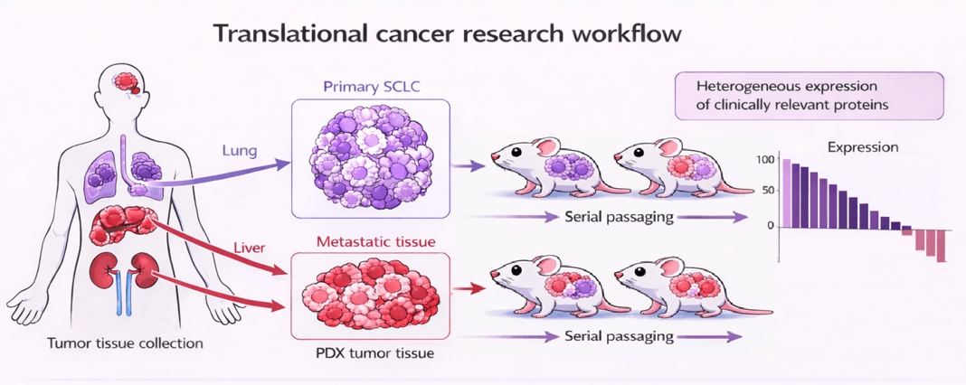 Schematic representation of the translational cancer research workflow, illustrating the generation of matched primary and metastatic SCLC PDTX models from patient-derived tissues. Serial passaging preserves tumor heterogeneity and enables the study of clinically relevant protein expression differences between primary and metastatic disease.